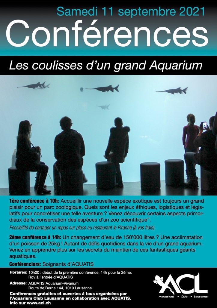 14h00 : Conférence : Un changement d’eau de 150’000 litres ? Une acclimatation d’un poisson de 25kg ! Autant de défis quotidiens dans la vie d’un grand aquarium. Venez en apprendre plus sur les secrets du maintien de ces fantastiques géants aquatiques. Par les soigneurs d’Aquatis.